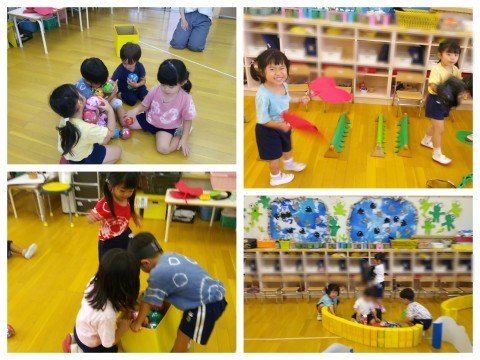 午後からの好きな遊びの時間にもカエルごっこを楽しんでいた子ども達。カラスやザリガニ、ウサギなど、今まで先生がやっていた役の衣装を置いておくと、「やりたい!」「先生、お花の蜜もほしい!」と、どんどん自分達で遊び始める姿が見られましたよ(*^▽^*)