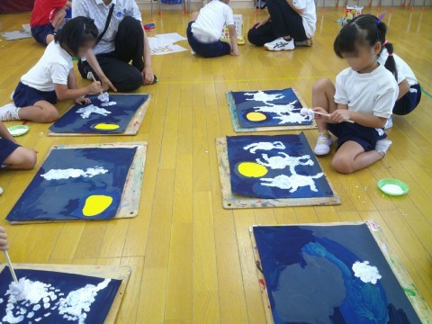 保育室では、昨日描いた満月の下に、ウサギを描きました。ウサギのふわふわを表現するために、筆ではなくタンポを使ってみました。ウサギの形をイメージしながらタンポを使うのは少し難しいのですが「手をつないでいるウサギ達を描こう」「見て!ふわふわのしっぽもつけたよ」と楽しそうに話しながら描いていた子ども達です(^▽^)