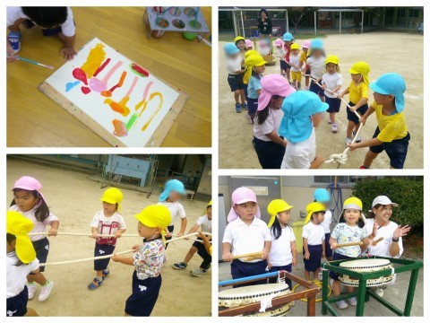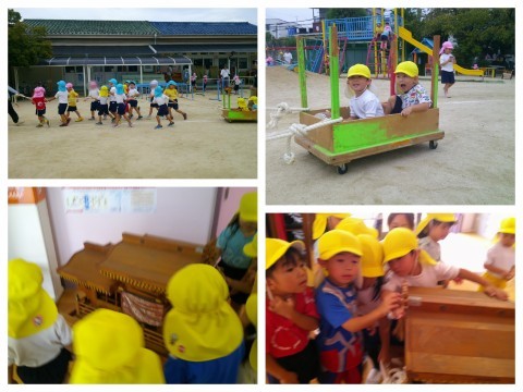 午後からは、だんじりごっこを楽しみました。「そーりゃー そーりゃー」と、年長さんや年中さんの真似っこをしてだんじり曳きや、太鼓を鳴らして遊びました。幼稚園のミニだんじりも見て、少しずつだんじりを見るのが楽しみになっている様子です(^O^)