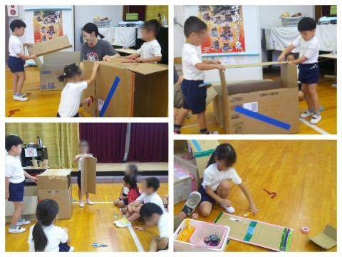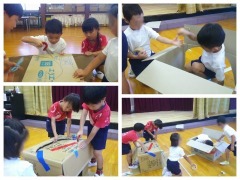 土曜日のだんじり登園で、「みんなでもっと丈夫なだんじりを作ろう」と話していたすみれ組。さっそくだんじり作りが始まりました。話し合った結果、たくさんの友達に楽しんでもらえるよう『実際に乗れる大きなだんじり』と『一人でも引っ張って遊べるミニだんじり』をいくつか作ることにしました。『実際に乗れる大きなだんじりづくりチーム』の中でも『宮山だんじりチーム』と『市之町だんじりチーム』に分かれました。(チーム名はまだ変わるかもしれませんが…)