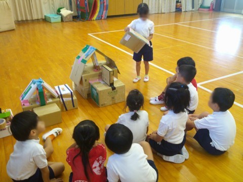 友達と相談したり、材料を選んだりしながら作っていました。「こんな風にしたいけど、どうしたらいいかな…」と迷っているところは振り返りの時に違うチームの友達に相談しています。まだまだ完成には時間がかかりそうですが「また明日も続きやろうね!」と話しています♪