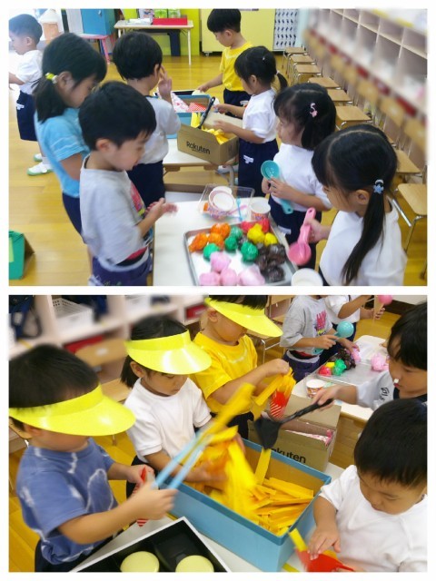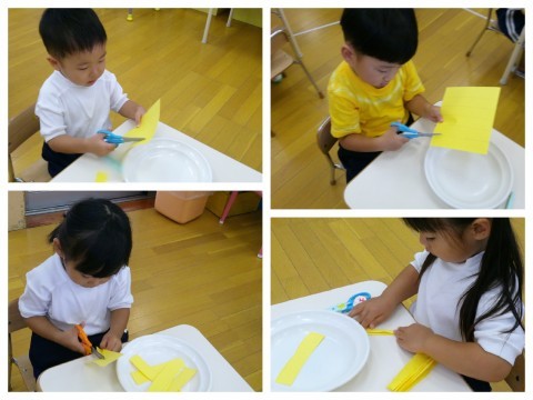 今日も、昨日作ったアイス屋さんや、ポテト屋さんでのごっこ遊びを楽しむ姿がありました。遊んでいると、ポテトがすぐに売り切れになってしまうことも・・・。そこで、みんなでポテトを作って増やすことにしました。大きなジャガイモに見立てた画用紙を、ハサミで切っていきます。線に沿って切る連続切りにチャレンジしましたよ。少し難しい連続切りですが、集中して取り組んでいました。切ったジャガイモは、半分に折ると、ポテトに変身!「もう1回作る」「もっと切りたい」と、繰り返し作ることも楽しみました♪作ったら、すぐに遊び始めていましたよ(^O^)