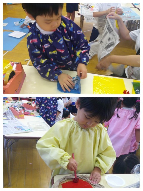 今日は,むしむしランドに食べ物やさんがあったらいいよね(^^♪ということで,食べ物を作りました。オムライスや焼きそば,フランクフルトにピザ!おいしそうな食べ物がたくさん。他にも,パフェやチョコレートなどのスイーツも作っていました。