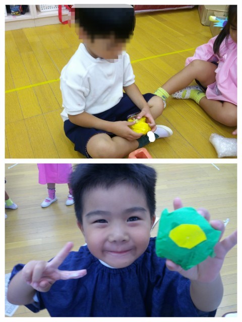 と、おいしそうな食べ物がどんどん出来上がってきています。はじめは、お友達の作っているものをみて“やってみよう!”と見て真似て作っていましたが、繰り返し取り組む中で、“こうしてみよう!”と、自分なりに新しいアイデアを取り入れて作る姿が見られます。アイス作りも、折り紙・おはながみ・ポリ袋などその子によって作り方は様々🍨どれもこだわりをもって作っています♪