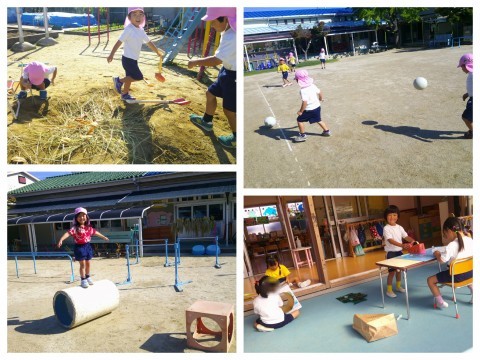 今日は、日差しが暑いくらいのいい天気でした♪園庭では、サッカーや砂場遊び、制作遊びなど好きな遊びを楽しんでいます(^^♪稲刈りをした時に地域の方にいただいた藁を築山のてっぺんに集めてバーベキューごっこをしている子もいます☺
