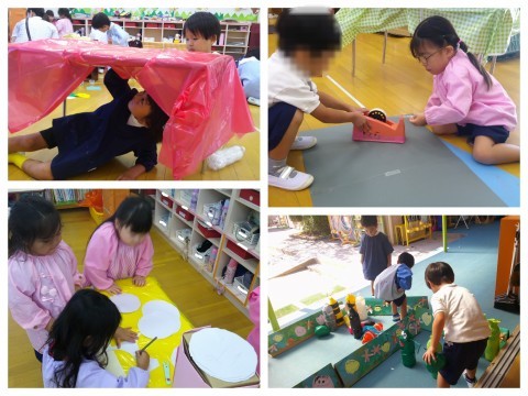 と、完成を喜んだり、誘い合う姿が見られます。1人で夢中になる姿も素敵ですが、一緒に思いを通わせながら作るのも素敵ですね✨中には、ぼくがしたかったのに!こうしたかったのに!と、思いがぶつかってしまうこともありますが、「どうしたらうまくいくのか」「どんな風にしたら楽しくなるのか」を考えたり、話し合ったりするなかで相手の気持ちを知ったり、自分の気持ちに折り合いをつけたりするなどの機会も大切にしていこうと思います。