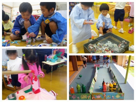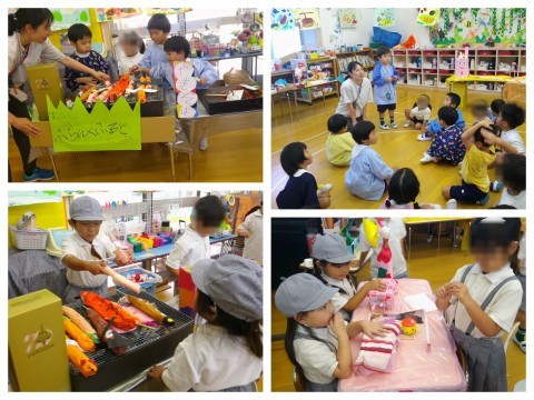 保育室に戻ってからは、むしむしランドのお店作りをしました。自分のやりたいお店にそれぞれ分かれて、どんなお店にしたいか、何があるといいかなど考えて作っています。