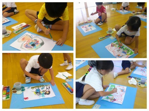 保育室に戻ってからは、個人の固形絵の具を楽しみました。さくら組の時に何度か使ったことがあるので、使い方を思い出しながら楽しみました。混色も楽しくなってきて「見て!こんな色になったよ!」「その色どうやって作ったん?」と友達との伝え合いもたくさん見られています。固形絵の具のメリットの1つは「乾きやすい」ことです。描いた絵がすぐに乾いたので「持って帰っていい?」「お家の人に見せたい!」という声がたくさん挙がりました。持ち帰っていますので、ぜひ見てあげてくださいね(^▽^)/