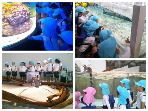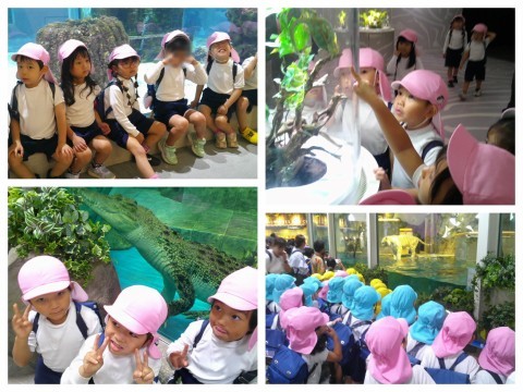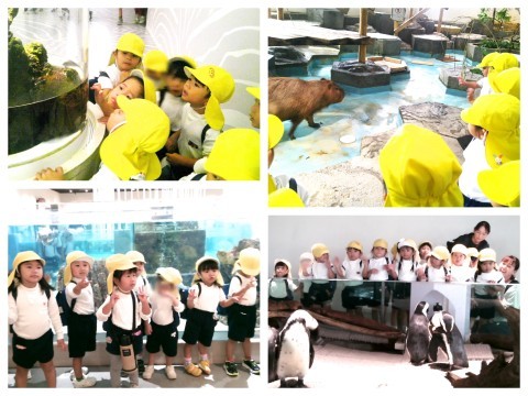 子どもたちも楽しみにしていた園外保育!みんなでバスに乗ってニフレルに出発♪バスの中では、どんな生き物がいるかな?と会話を楽しんだり、モノレールや新幹線を見たりしながら楽しみました。ニフレルに着くと、たくさんの水槽が展示されており、