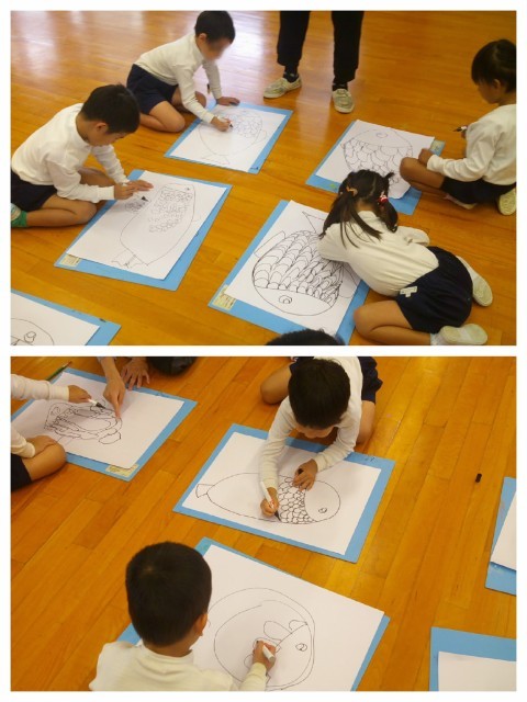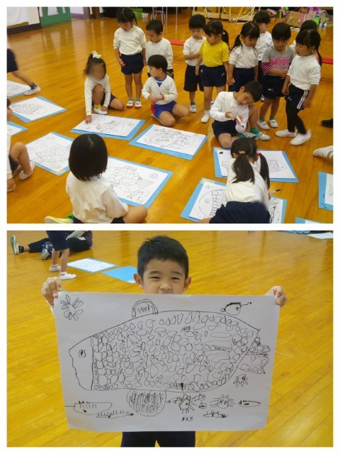 昨日ニフレルへ園外保育に行った子ども達。いろいろな海の生き物を見てきたので、『にじいろのさかな』の絵本を読んでから魚の絵を描きました。最近楽しくなってきている個人絵の具を使って色を塗ろう、と話すと、自分で塗ることのできる大きさを考えながらウロコを書く姿も見られました。途中、遊戯室の箱を取りに来たたんぽぽ組さんも絵を覗いてくれました。「すごーい」と言ってもらい、嬉しそうでした♪周りにも昨日見た色々な生き物をいっぱい描いて、ペン描きは完成!個性あふれる魚になったので、明日色をつけるのが楽しみです(^▽^)