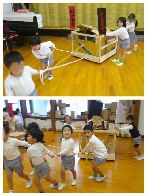 だんじりでは、今日が待ちに待った「他のクラスの友達に来てもらう日」でした。今日はさくら組の友達が遊びに来てくれました。とってもはりきって、説明したり掛け声をかけたりしていたすみれ組です。反省点や改善点もあったようなので、またみんなで相談しながら取り組んでいこうと思います。