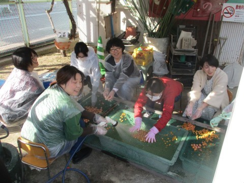 本日はPTAの有志の方や卒園児の保護者の方が、幼稚園で収穫した銀杏の作業に来てくださいました。
