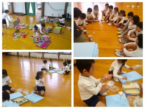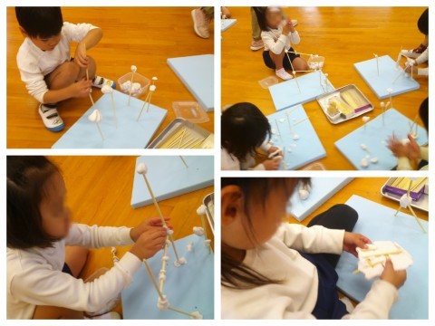 午後からは遊戯室でお楽しみ♪先日から楽しんでいる粘土と、いろいろな長さの割り箸を組み合わせて遊びました。「何ができるかな?」「何でもいいよ♪」と始めると、「カニ」「洗濯物干すところ」「階段みたいなやつ」と思い思いに作っていきました。粘土を結合として用いることで、立体も構成できるようになり、それもまた面白かったようです。みんな同じ「粘土」と「割り箸」を使ったのに、できたものは様々。子ども同士で自然と「これ何つくったん?」「見て!こんなんできたで!」と鑑賞し合ったり伝え合ったりする姿もたくさん見られました。また明日続きをしようね、と話しています(^▽^)/