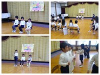 今日は明日の誕生会についての話し合いをしました。「ハンカチ落としをしよう」という案が出ましたが、「さくら組さんも一緒にするから、ハンカチよりももっと見えやすくて『自分のところに落とされた』って分かるものがいいんじゃない?」「両手で持って走ったら転ぶかもしれないから、大き過ぎないものがいいんじゃない?」ということで、みんなでいろいろと案を出し合った結果、小さいブロックにリボンを巻いたプレゼントを落とす「プレゼント落とし」をすることになりました。自分達でやってみても楽しかったようで「明日さくら組さんと一緒にするの、楽しみやなあ」と話しています。