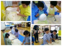 3連休を経たこなしお絵の具の様子も見に行きました。すると固まり、ざらざらとした手触りになっていました。そーっと紙からはがしてみると、きれいにはがれてビックリ!「見て!大きいの取れた!」「パキッて割れるで!」と、割らないように取ることを楽しんでいる子もいれば、割ることを楽しんでいる子もいました(^▽^)「きれいやからお家の人にも見せたい」とのことだったので、持ち帰っています。ぜひ一緒に見てあげてくださいね♪