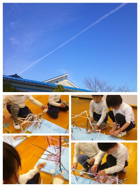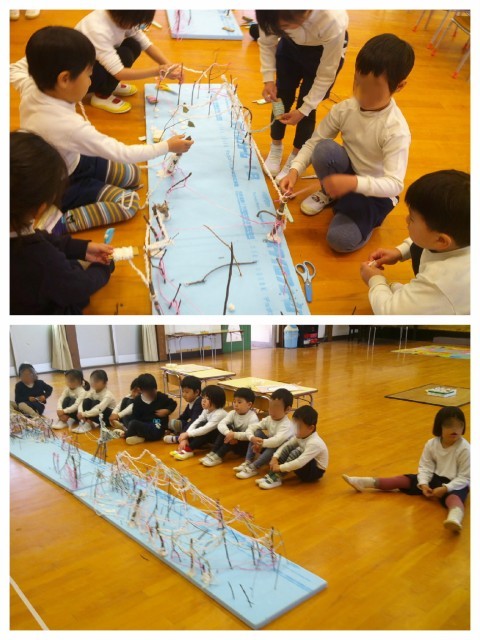 遊戯室では、枝と毛糸を使って遊びました。自然物と粘土で遊んできた経験を生かしつつ、毛糸をどう枝に巻き付けていくかや、友達とどうつなげていくかを試行錯誤しながら取り組んでいました。自分が毛糸を強く引っ張り過ぎると、つながっている友達の枝にも干渉してしまうので、力加減の調整も必要です。何本もの枝に渡って毛糸をかけたり、1本の枝に複数の毛糸を巻き付けたり、発想は無限大(^^)またまた素敵な作品になってきました。「まだこっちもつなげたい!」「もっと続きがしたい!」とのことだったので、また月曜日にも続きをしようね、と話しています♪