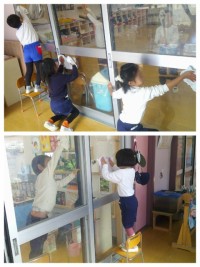 保育室では大掃除に関する紙芝居を見ました。今年一年使った道具や部屋の中をきれいにして、新しい年をピカピカの気持ちのいい状態で迎えることを知り、張りきってミニほうきとちりとりでロッカーの埃を掃い、雑巾でロッカーと床をきれいに拭きました。とってもきれいになって気持ちのいいお部屋になりました。新年が明けてみんなが登園する時もきっと「きれいなお部屋で気持ちがいいなあ。」と思ってくれることでしょう。今年の登園もあと1日!笑顔で「よいお年を」とご挨拶できることを楽しみにしています。