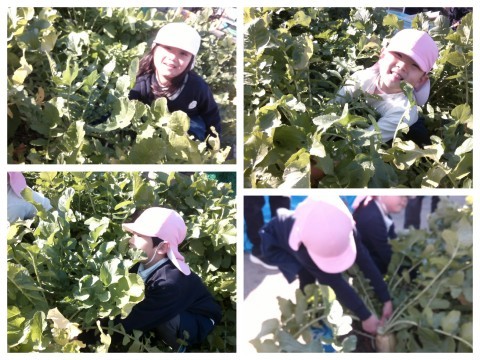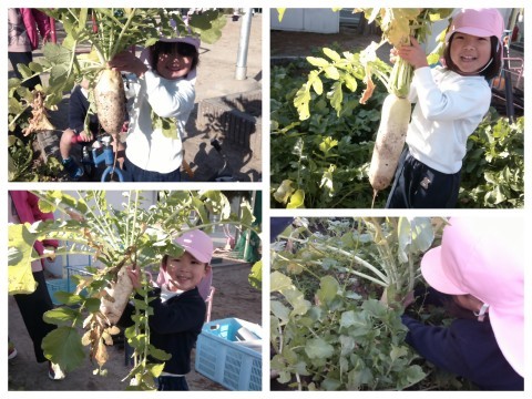 今日は、大根を収穫しました。青々と生い茂った葉をかき分けて、おいしそうな大根を探して抜きました。うんとこしょ!どっこいしょ!と、力を入れて抜いていましたよ!様々な形の大根にみんなにっこり☺