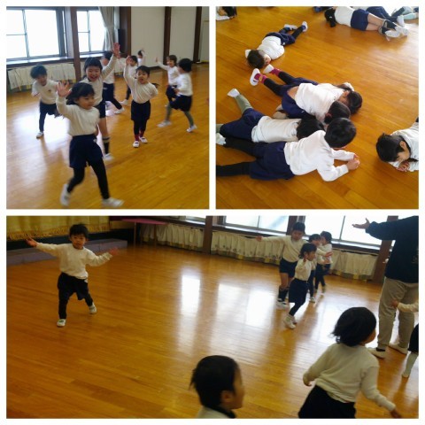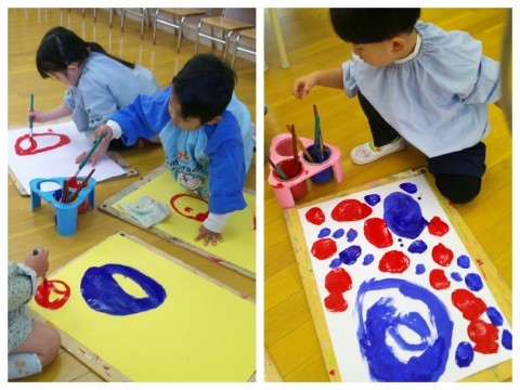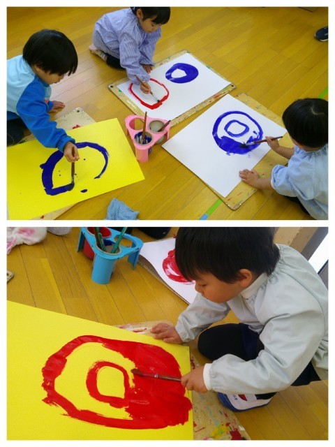今日は、お正月あそびや、絵本、「だるまさんがころんだ」などで親しんできた『だるまさん』の絵を描きました。赤と青の絵具を使って、「何をしているだるまさんを描こうかな?」とそれぞれに考えて描き始めました。「にらめっこしているだるまさん!」「4人家族のだるまさんだよ」「おともだちとだるまさんがころんだしているよ」「凧あげしているだるまさん!」とそれぞれにイメージを広げて楽しそうに描いていました。顔を描いたら完成です♪どんなだるまさんができるか楽しみです。