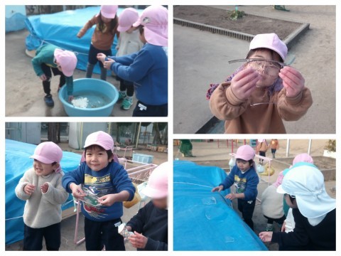 と,大きな声が。行ってみると,水やり用のたらいの中の水の表面が凍っていました。手やスコップですくって集めていましたよ。キラキラしてる✨と言って見せ合ったり,落として“パリンッ!”と粉々になったりするのを楽しんだり,「おうちみたい!」と偶然の形を喜んだり♪「あーー!手が痛いーー!」「つめたいー!」と言いながらも氷見つけを楽しんでいました。寒い冬ならではの発見と遊びですね⛄