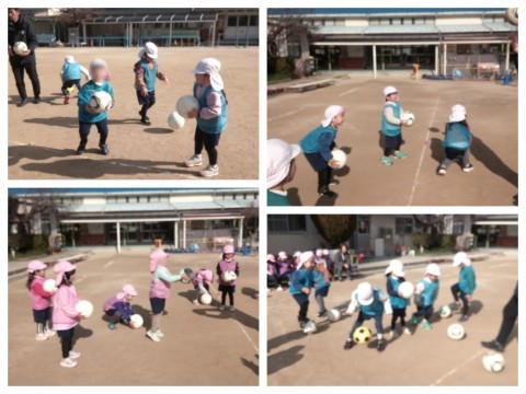 好きな遊びの時間にサッカーしよう!と誘いあって遊ぶ姿が毎日のように見られていました。さくら組の順番になると,急いで園庭に!元気に挨拶をしてサッカー教室スタート⚽まずは,ボールを投げたり足にはさんだりしてボール慣れです。その後は,お待ちかねのゲーム形式で楽しみました♪ルールを思い出しながら,自分のゴールめがけてボールを追いかけて蹴っていましたよ!中には,ゴールを守ろうとキーパーになって守る子も(^^♪ゴールをきめた子はコーチや友達とハイタッチをして得意気の表情☺