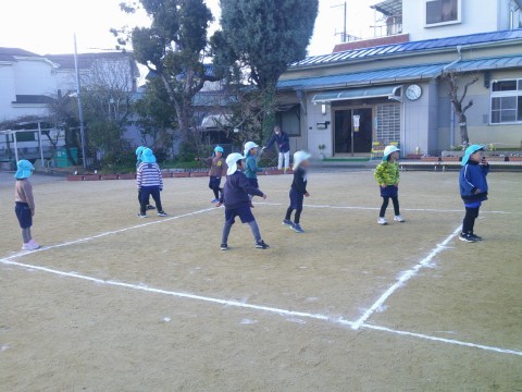 今日は久しぶりにみんなでドッヂボールをしました。みんな投げるのも受けるのもよけるのも上達していて、3回戦しましたが、どの勝負もとても均衡して、最後までなかなか勝敗がつきませんでした。とても冷たい風が吹いていましたが、「まだまだやりたい!」と元気いっぱいの子ども達です。