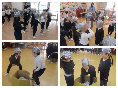 今日は、昨日作ったねずみの被り物を付けてねずみになって遊びました♪絵本でねずみたちがもちつきをしている場面をみて、みんなも早速もちつきスタート!重い杵を持って「よいしょ!よいしょ!」と力いっぱいついていました。もちをこねたり、杵でギュギュと押したりと、昨年の餅つきの経験を思い出して身振り表現を楽しんでいる子もいました。びろーーんとのびるやわらかいお餅ができました♪