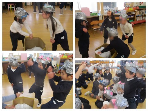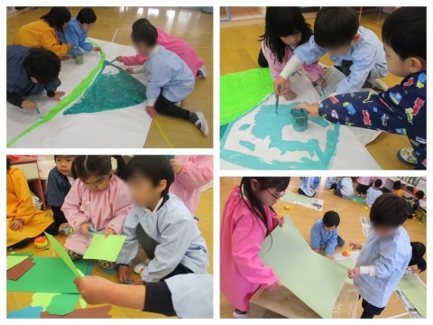 ごっこ遊びの中で使う、臼やつづら、壁面もみんなでつくりましたよ。道具がなくても楽しいごっこ遊びですが、道具があることで更にイメージが膨らんでいきそうです♪つづらの中に、小判とかおもちをいっぱい入れたいなと言っている子もいたので、来週またみんなで作っていこうと思います。