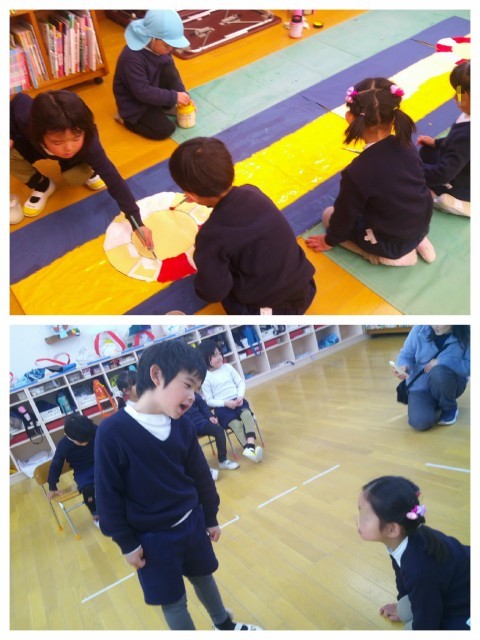 「お休みしていた子もいるから、また最初から、冒険のお話を全部やってみよう!」という声があがったので、さっそくみんなでやってみました。最初から最後まで続けて遊ぶのはとても長い時間かかりましたが、みんなとても集中していて、最後まで遊ぶことができました。「良い感じやん!」「また遊戯室でもやってみよう!」と話しています。