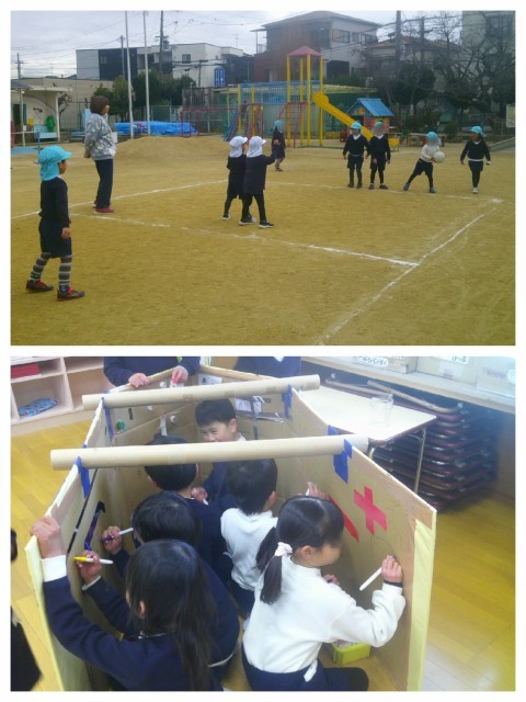 劇あそびは、遊戯室でも楽しみ始めています。「お客さんはどこから見てるんだったかな」「じゃあこっちから出てくることにしようか」と話し合いながら進めています。「早く本番の役を決めたい」という気持ちと「まだまだいろいろな役で遊びたい」という気持ちの両方があるようです(^^)