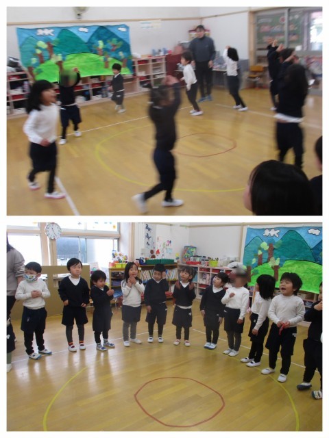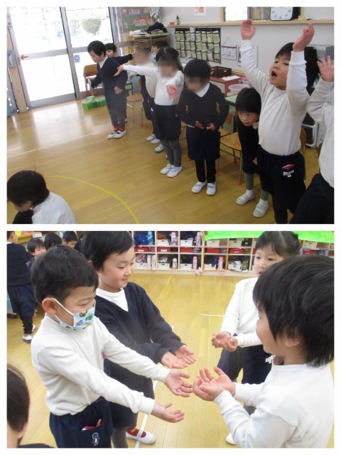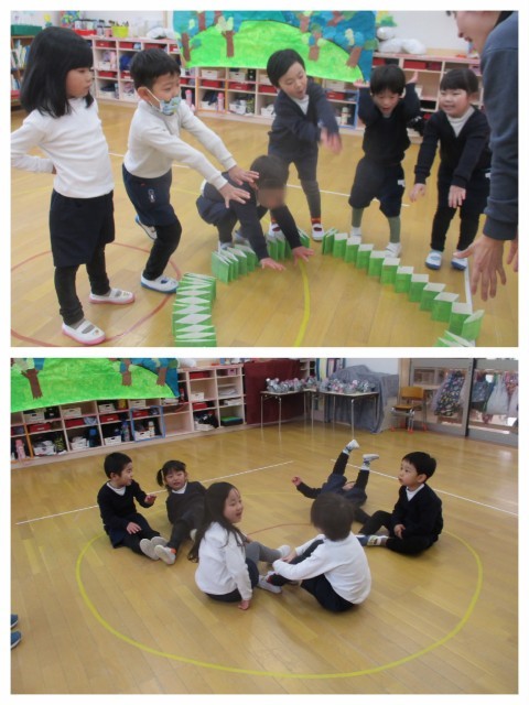 繰り返し、お話の世界に入ってごっこ遊びを楽しむ中で、自然と子ども達から台詞のような言葉も出てきています☺そんな友達の姿に、自分だったらこう言ってみようと広がってきています♪絵本とはまた違った子ども達ならではの考えや表現が面白いです(^^♪