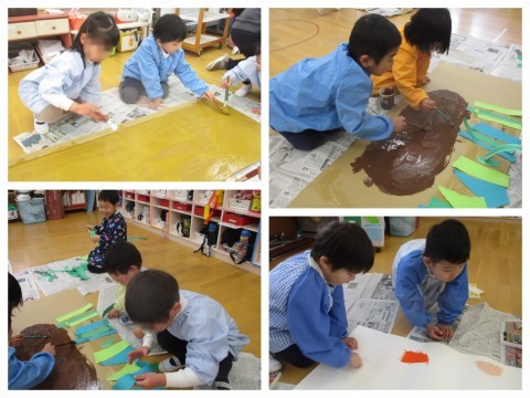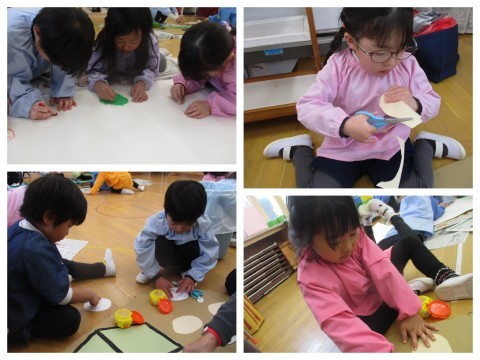 劇遊びで使う道具もみんなで作りましたよ!今日は、おむすびが転がる穴・おじいさんの家・ねずみにもらったたくさんのお餅・お鍋を作りました♪明日、みんなが作った道具も使って遊ぼうね♪