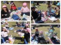 「お弁当も一緒に遊戯室で食べたい!」という子どもたちの提案で、一緒に食べることになりました。クラスの子どもたちが入り混じって、シートで食べました。笑顔がいっぱいで、おいしくお弁当をいただきました。