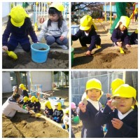 今日は、朝の体操が終わってから、園庭の畑にじゃがいもを植えました。種いもを手に取ると、「これがじゃがいもになるの?」「早く食べたいな!」と目を輝かせながら、土のお布団をそっとかけてあげる姿が見られました。土の感触を楽しみながら、みんなで「大きくなあれ」と気持ちを込めて植えることができました。収穫の時期は、みんながすみれ組さんになってから♪まだ先ですが、これから水やりや観察を通して、生長の様子を見守っていきたいと思います。