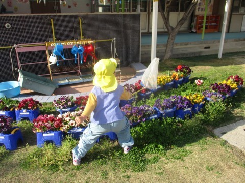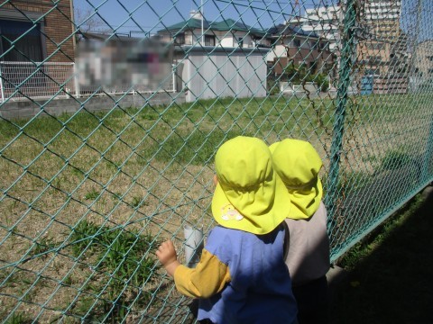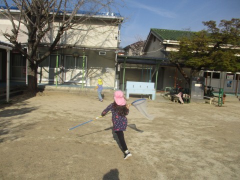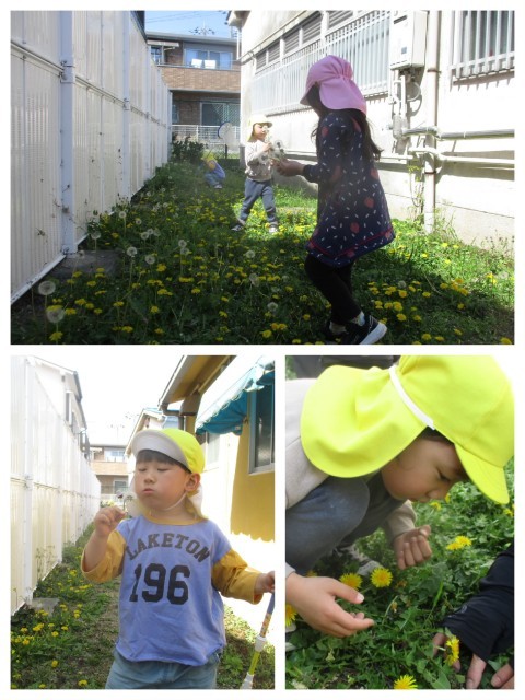 幼稚園の花壇にチョウが飛んできています。チョウを捕まえようと追いかけますが「チョウは速いな」惜しいところまでいくのですが、なかなか捕まえられません。園舎の裏まで探しに行くとまるでたんぽぽ畑のように一面たんぽぽが咲いていました。綿毛を見つけて「ふ~っ!」空高くたんぽぽの綿毛が飛んでいきましたね。たんぽぽの葉っぱの下からダンゴムシやテントウムシを見つけては捕まえて遊びました。するとフェンスの向こう側にチョウを発見☆捕まえたいけれど・・・とちょっぴり残念そうな後ろ姿でした。夕方も園庭でチョウを捕まえようと追いかけます。チョウとの追いかけっこですね。今日のところはチョウが逃げ切りました☆また遊ぼうね!