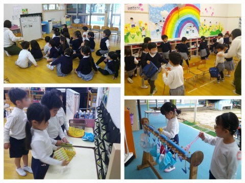 すみれ組になってから初めての身支度だったので、みんなで順序を確認しながら取り組みました。さくら組の時の方法から少し変わったところもいくつかあるので、少し戸惑う姿も見られましたが、先生や友達と確認し合いながら取り組むことができました♪