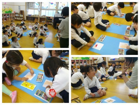 身支度が済んだ後は、遊戯室に行ってリズム運動を楽しんだり、当番表にするための自分の顔をクレヨンで描いたりしました。子ども達が描く自分の顔の絵は、どの子も本人にそっくりで、見ていてとても微笑ましかったです(^▽^)