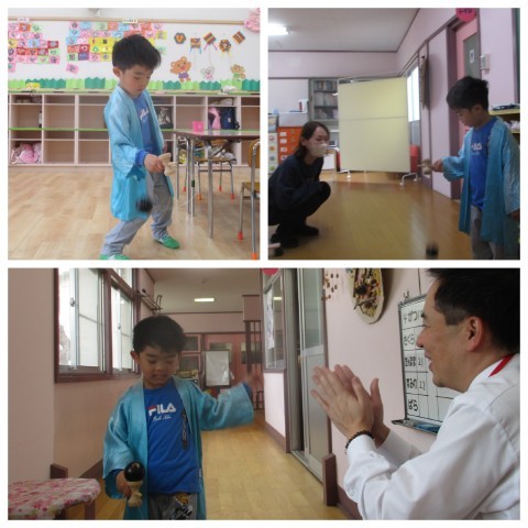 けん玉を見つけた年中さんは「園長先生2回失敗したよ!」と進級式でのけん玉チャレンジをよく覚えていて、すぐに挑戦していました。何度も何度も繰り返していくうちに、だんだんコツをつかんできていました。見事に成功すると園長先生にも見てもらおうと職員室へ。園長先生の前で成功するととても嬉しそうでしたね!
