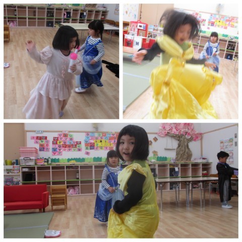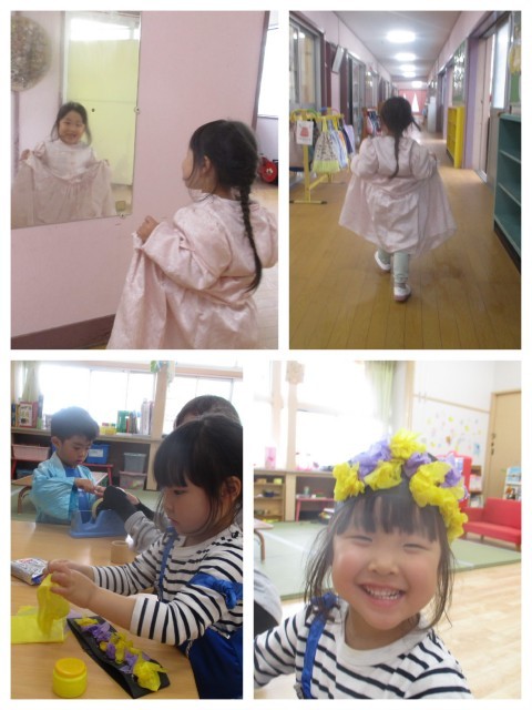 プリンセスが大好きな年少さんは、ドレスを着ては鏡をのぞき「かわいっ♪」と満足したり、くるりと回転してみたりして遊びました。好きな色の冠(ティアラ)をつくることもできて大満足☆とっても似合いますね。また幼稚園でいっぱい遊ぼうね!