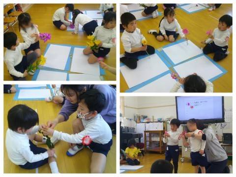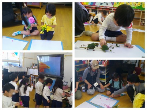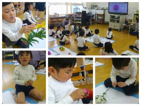 今日は昨日の続きのお花の観察あそびを楽しみました。昨日お家に帰ってから花の名前を調べてきてくれた子も多く「ガーベラやった!」「バンダっていうねん!」と張り切って教えてくれました。みんなで匂いをかいだり観察したりしていると、「花の中に骨みたいなのがあった!」「花びらの先にフワフワついてた!」「蕾を剥いたら、中から種が出てきた!」「こすったら色が出た!絵が描ける!」と大発見があふれました✨小さいものはPCカメラで撮ってモニターに映し、みんなで見れるようにしていると「僕のもみんなに見せてあげて!」「これも見つけたから大きく映して!」と友達や先生に見せたり伝えたりすることも嬉しそうでした。一人ひとりの大発見を全て教えてほしい気持ちは山々でしたが、降園時間になってしまったので、急遽お家の人に保育室まで入っていただき、子ども達の大発見を聞いていただきました。(急な対応、ありがとうございました。)