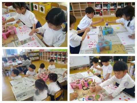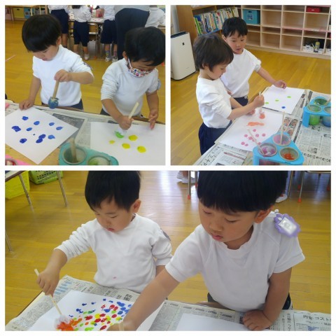 今日は、さくら組になって初めて絵の具遊びをしました(*^^*)最初のお約束や、絵の具の使い方。最後まできちんと話を聞いてすることが出来ました。お部屋では本物の鯉のぼりを見てさわって大喜び!(^^)!本物のを見ることで製作意欲もでてきたようでみんな上手でしたよ(^▽^)/出来上がったらみんなで一緒に遊んで持ち帰りますので楽しみにしていてくださいね(*^^*)