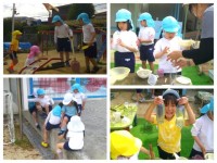 夢中になって遊んでいると、砂場の中にダンゴムシ発見!その声に、見せてーと集まる子ども達。まだまだ一人でじっくり遊ぶ姿が多く見られる時期ではありますが、同じ空間にいるお友だちのことも感じながら遊んでいます。友達の様子にふと目を向けたり、気にかけたりする姿も見られ、少しずつ関わりが広がっていけばと思います。