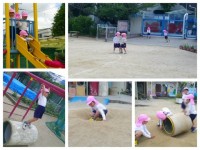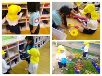 今日もとても天候が良く、鬼ごっこや砂遊び、色水遊びなど、朝から園庭でのびのびと遊びました。さっそくペットボトルを持って来てくれた友達もいました。ありがとうございます(^^)