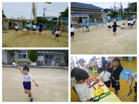 保育参加が終わった後は、こいのぼりの吹き流しを作りました。好きな紙テープを選んで、糊で貼り付けました。均等に貼るのが難しい様子でしたが、先生にコツを教えてもらって取り組んでいましたよ♪できたら早速園庭に!ヒラヒラと風に揺れる様子がとてもきれいで、手を挙げて一生懸命走っていました。