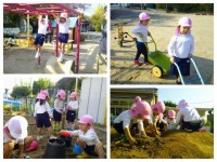 砂場でダンゴムシやナメクジを見つけ、嬉しそうに知らせてくれる子もいました。すると「何、何?」「ぼくも見たい!」と友達が集まり、嬉しそうに笑いあう姿も見られました。