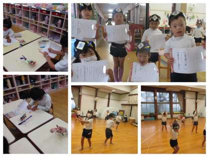 今日は、お母さん忍者との最後の修業の日。頑張ってチャレンジしている姿を見てもらい、子ども達は「できるよ!」「すごいでしょ!」と自信がついてきました。頑張っている友達を応援する温かい姿も見られて嬉しく思いました。