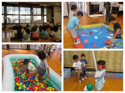 魚釣りや宝探しなど楽しいコーナーがたくさんあり、2〜3人のグループで体験しましたよ。「次は○○ちゃんだよ。」と教えてあげたり、「今度はこれがしたい」と主張したりしながらいろいろ学び合う姿が見られました。遊びの後には夏祭り音頭も踊った子どもたちです。