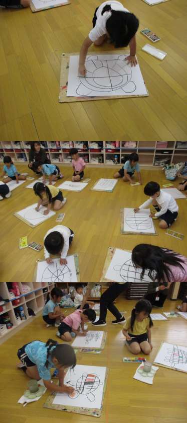保育室では、先週おやつ購入の時に見たカメを描いて、固型絵具で色を塗りました。固型絵具は2回目ですが、色混ぜの仕方を思い出しながら自分で描いたものを塗るという経験を楽しみました。甲羅の1つ1つを丁寧に集中して塗る姿がたくさん見られました(*^_^*)