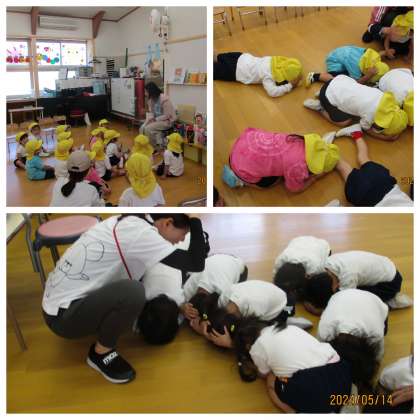 保育室でそれぞれに地震について担任から話を聞き、避難訓練を始めました。