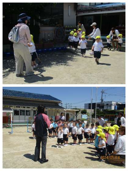 今日は29日(水)の地震の避難訓練(親子二次避難)に向けて午後から事前訓練を行いました。今回は3歳児さんも参加しました。